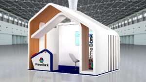 The concept behind the Prime Bank stall design focused on clarity, openness, and professionalism.